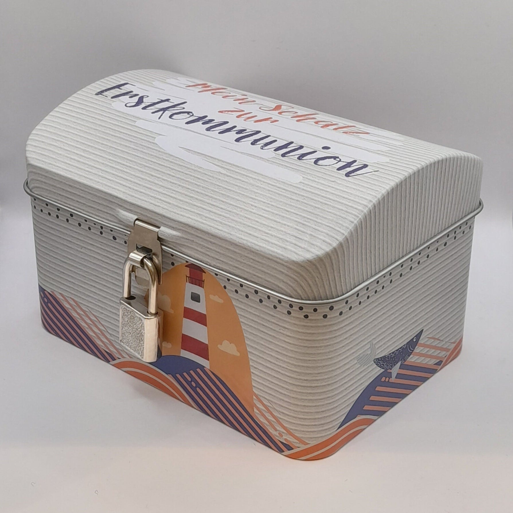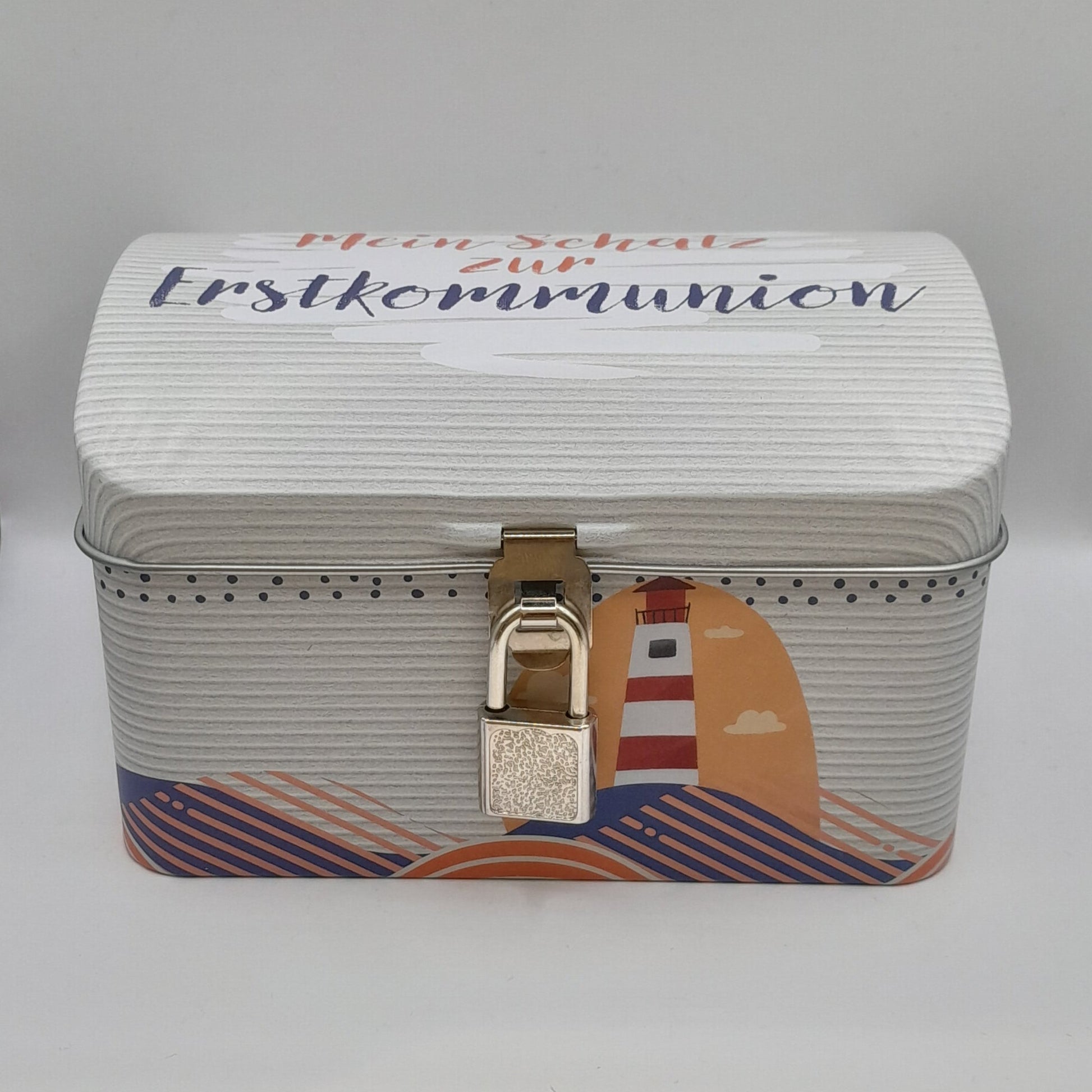 Farbig gestaltete Schatzkiste aus Metall mit Schloss, Inhalt: Begleitheft, Rosenkranz, Fisch-Karabinerhaken, Schlüsselband mit Schlüsselring, Flummi, Kreisel und Kompass