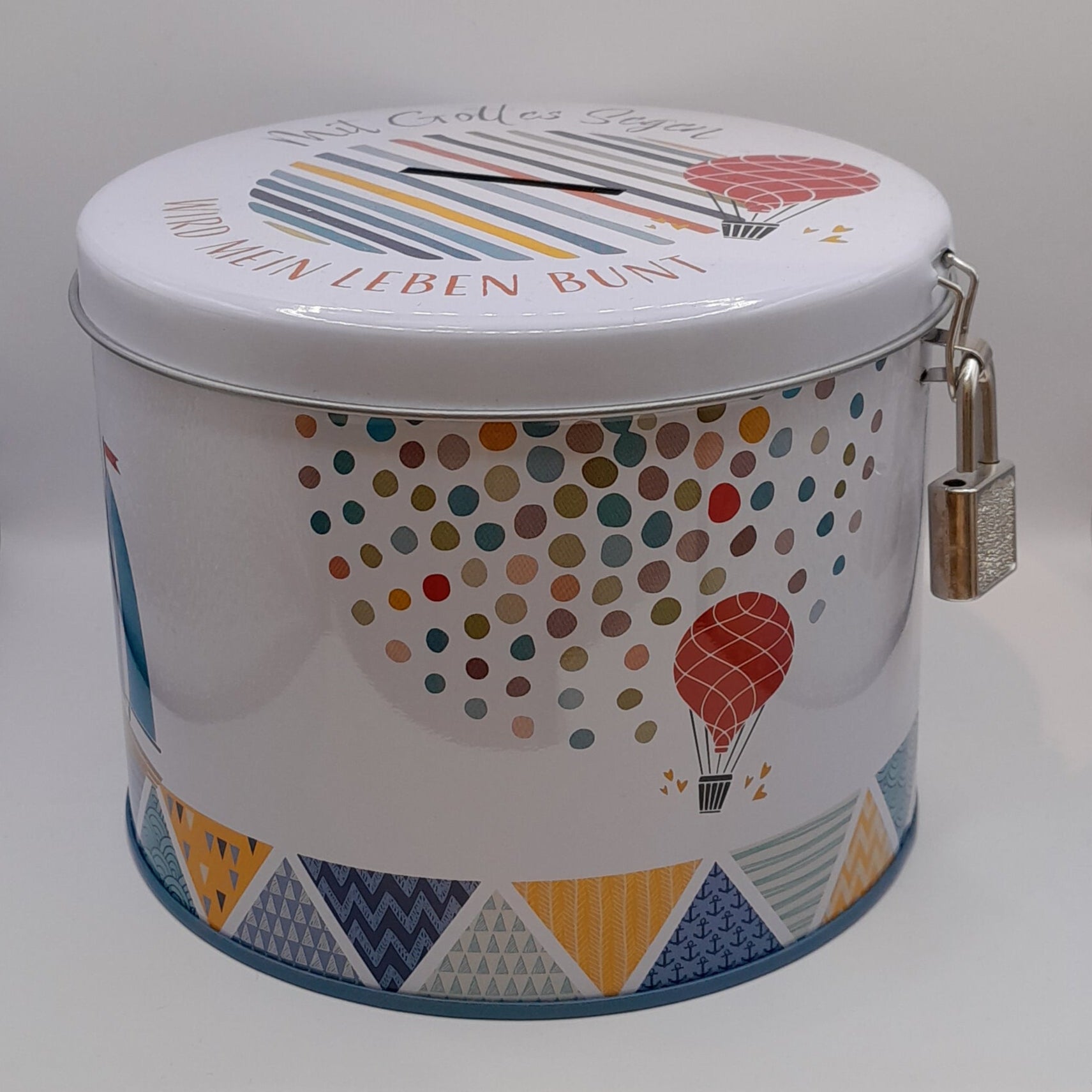 eine Spardose aus Metall, Größe ca. 10 cm, Durchmesser ca. 13 cm