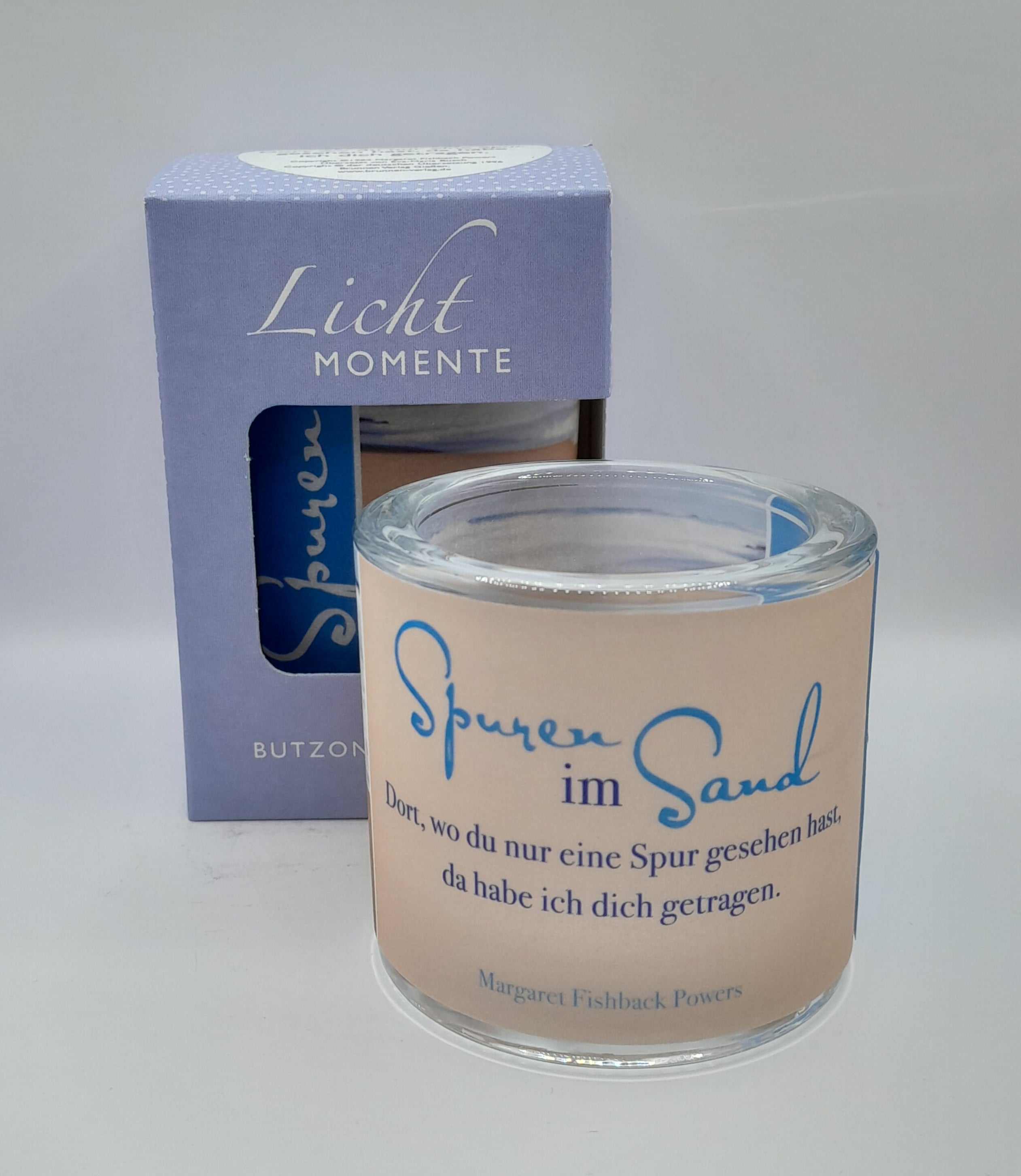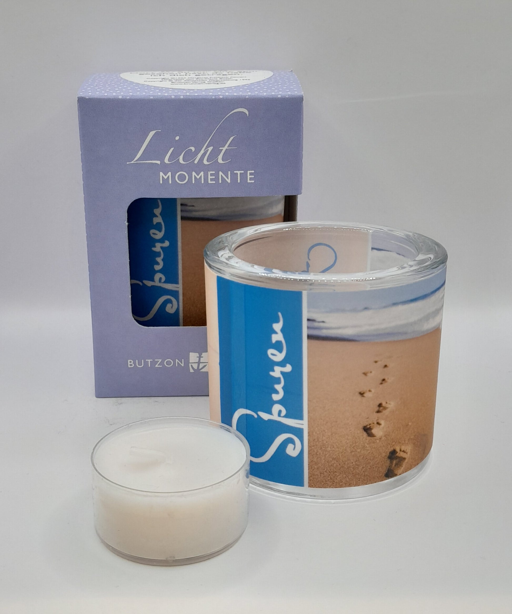 Der Karton enthält ein Glas (Durchmesser ca. 6,5 cm) und ein Teelicht.