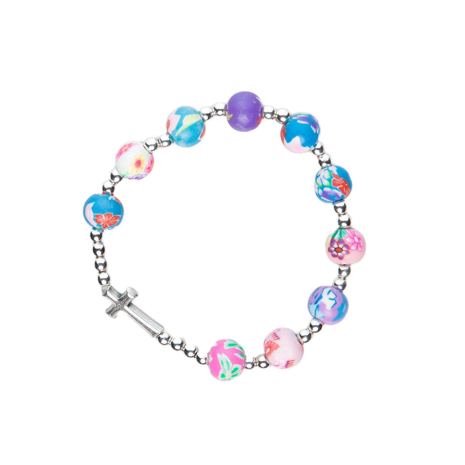 Dieses fröhliche Armband mit bunten Kunststoff-Perlen und silberfarbenem Kreuz ist dank eines Gummibandes elastisch und daher für kleinere und größere Handgelenke geeignet.