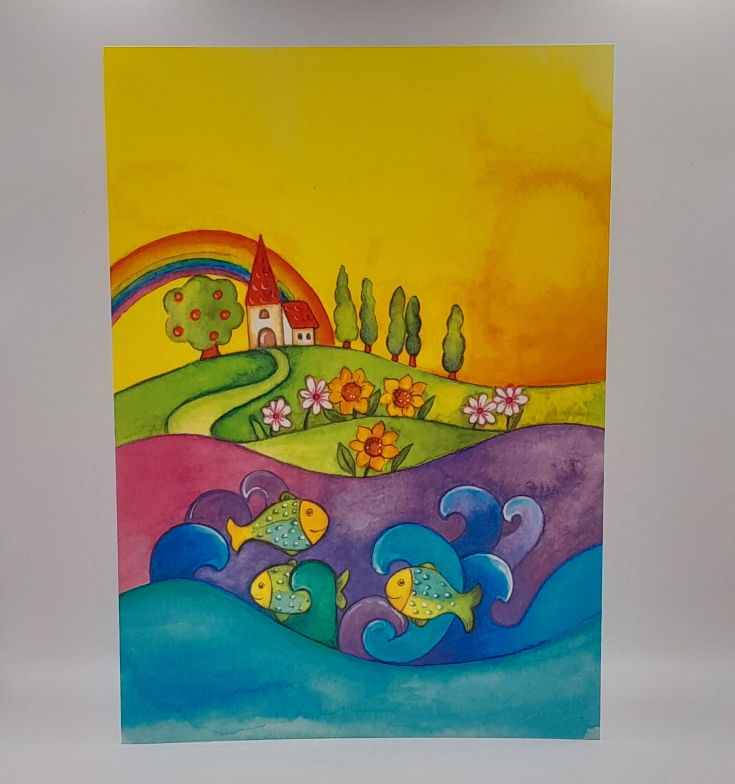 Motiv: Gelbe Landschaft mit Kirche und Fische