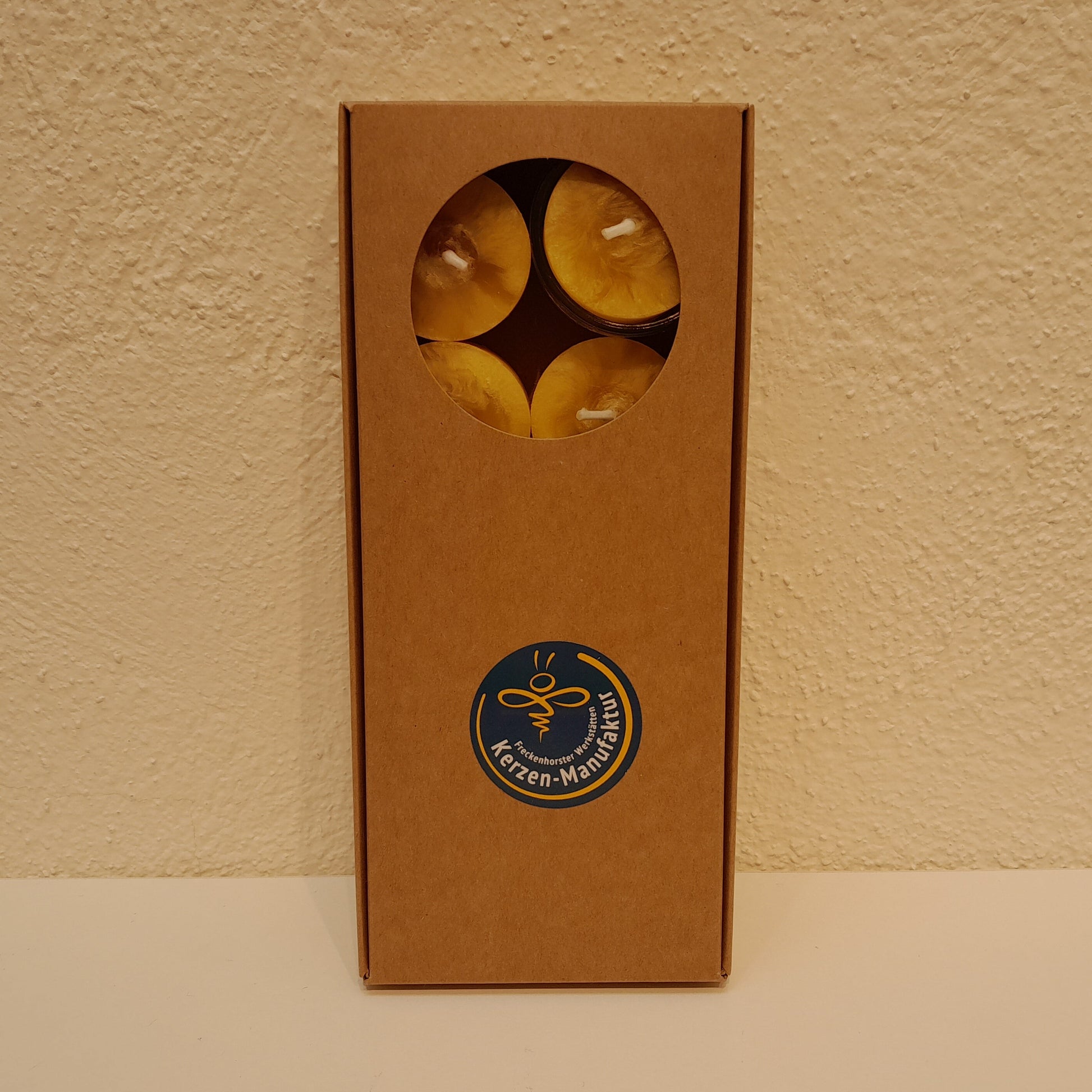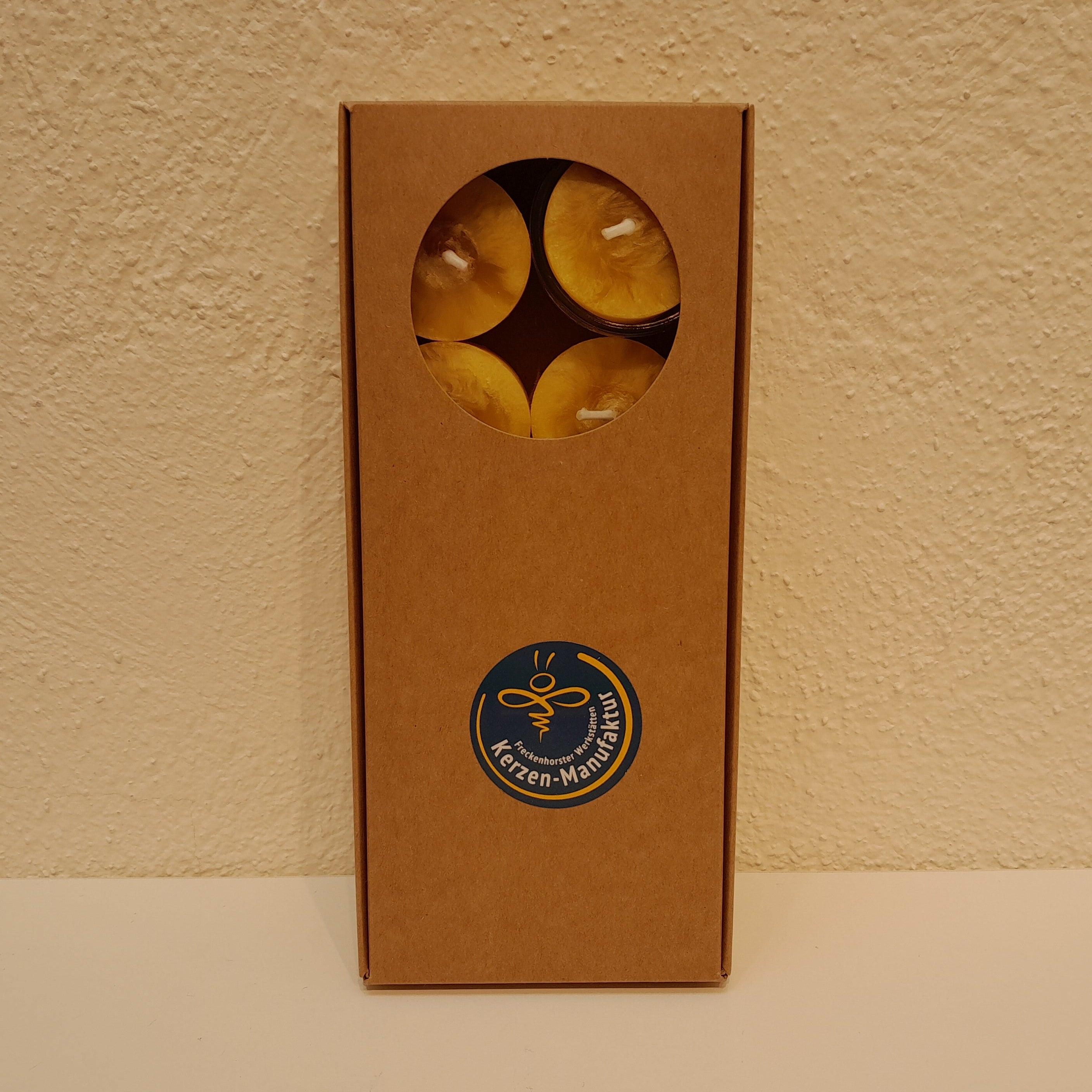 10 Teelichter aus handgekneteten Bienenwachs, im Geschenkset mit einem Teelichtglas,