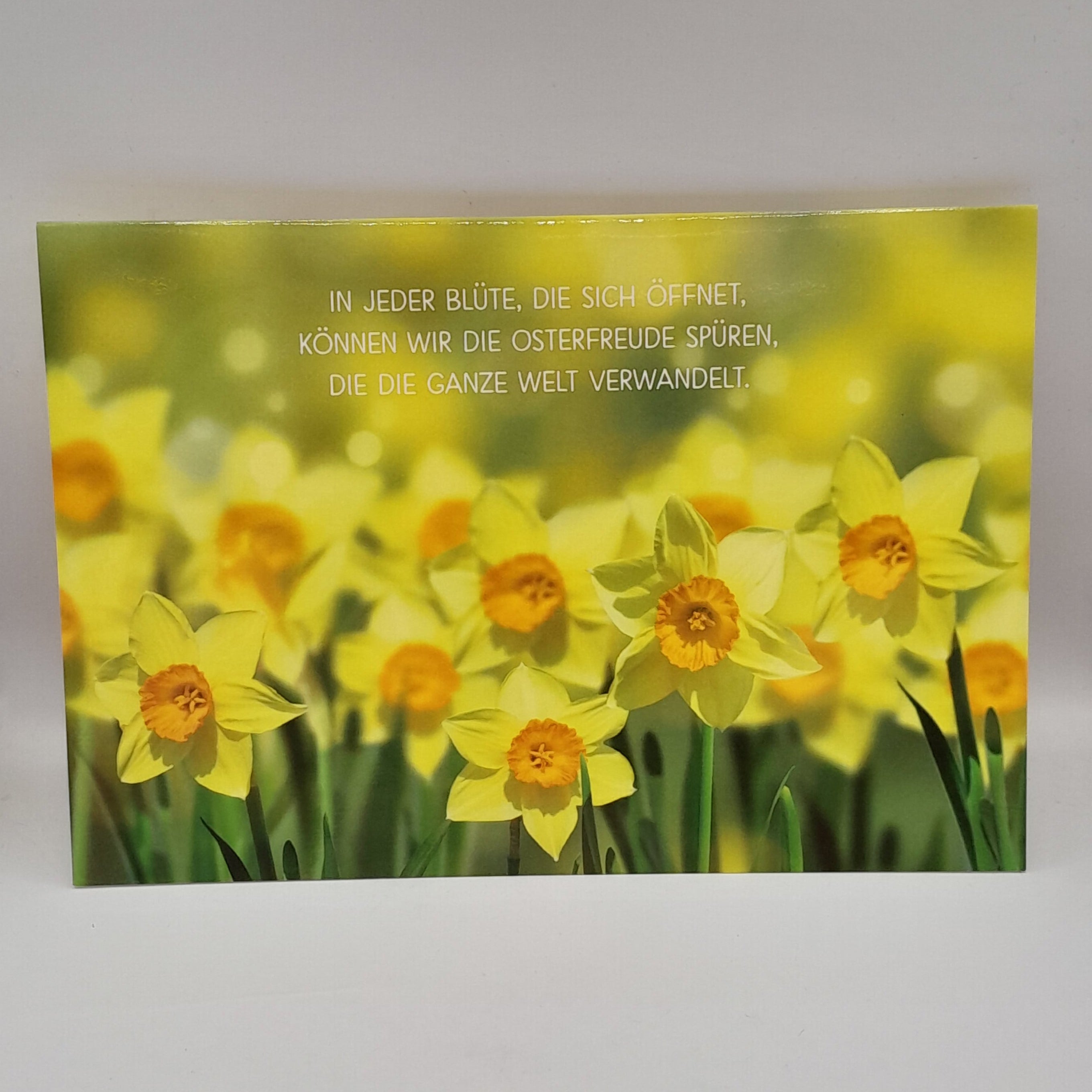 Text auf Vorderseite: In jeder Blüte, die sich öffnet, können wir die Osterfreude spüren, die die ganze Welt verwandelt.