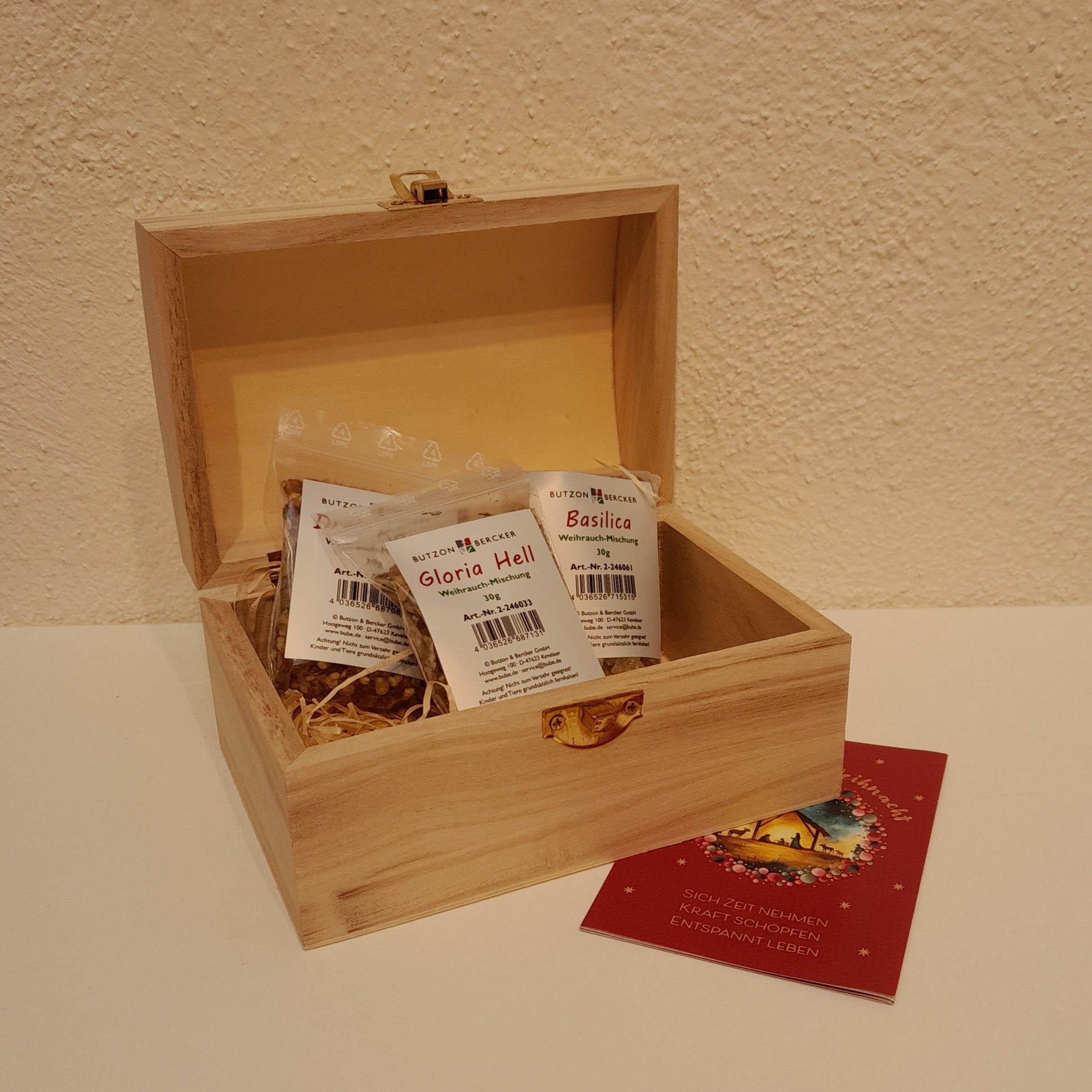 Wunderschöne Geschenkbox aus Holz, gefüllt mit drei Sorten Weihrauch:
