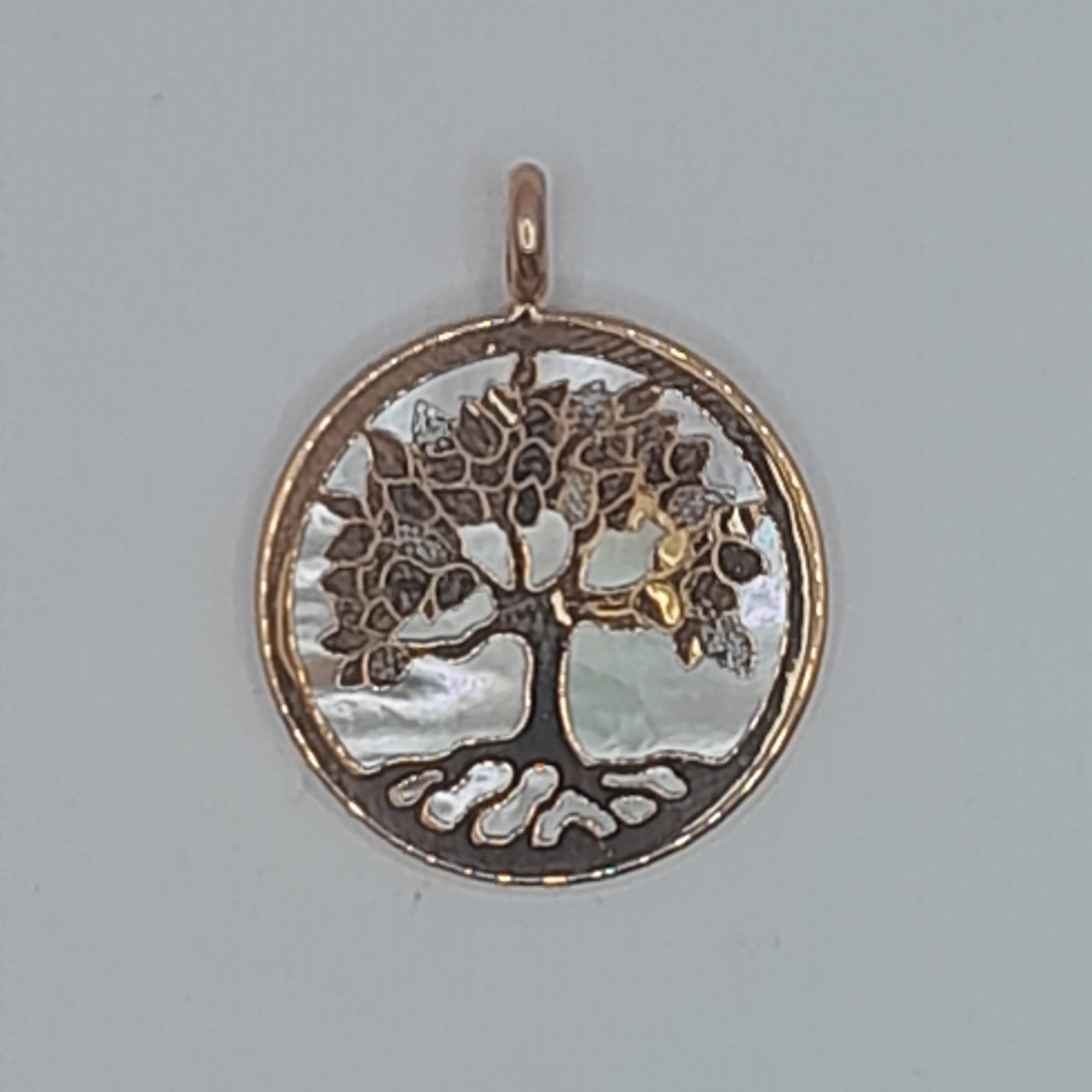 Dieser Kettenanhänger aus echtem 585 Roségold (Farbe nur leicht roséfarben) zeigt einen Lebensbaum auf einem Hintergrund aus Perlmutt und komplementiert fast jedes Outfit - ob schlichte Büro-Kleidung, oder elegantes Abendkleid.