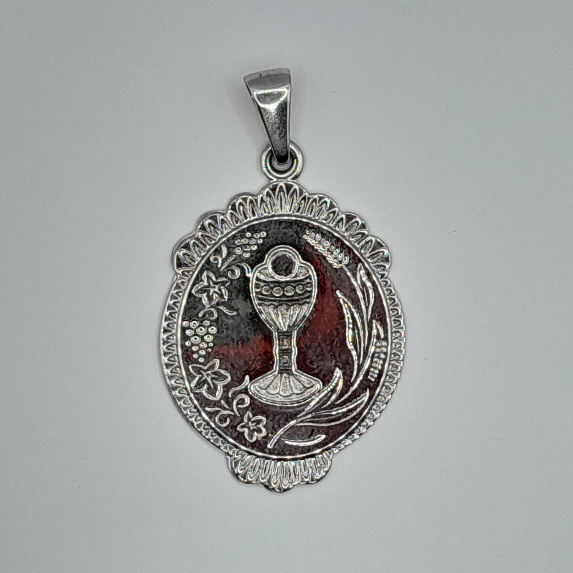 Der Kelch als kraftvolles Symbol für das Abendmahl und die Eucharistie, ist hier auf einem Kettenanhänger aus 925 Silber dargestellt, umrankt von Ähren und Weintrauben.