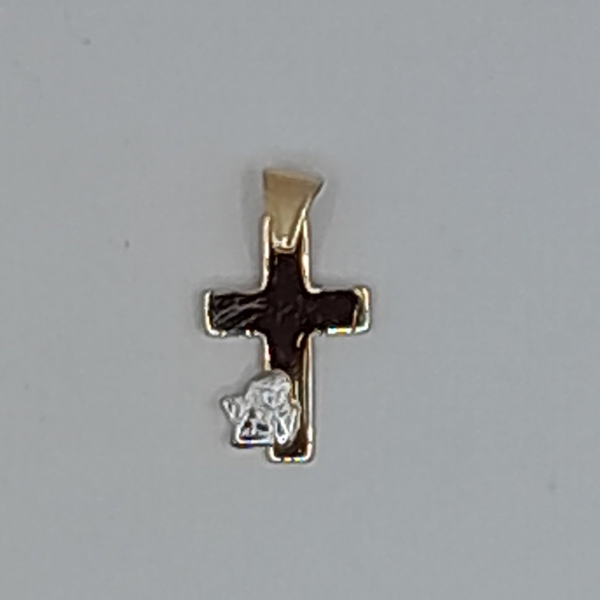 Kreuz (Gelbgold) mit einem kleinen Schutzengel (Weißgold) besetzt