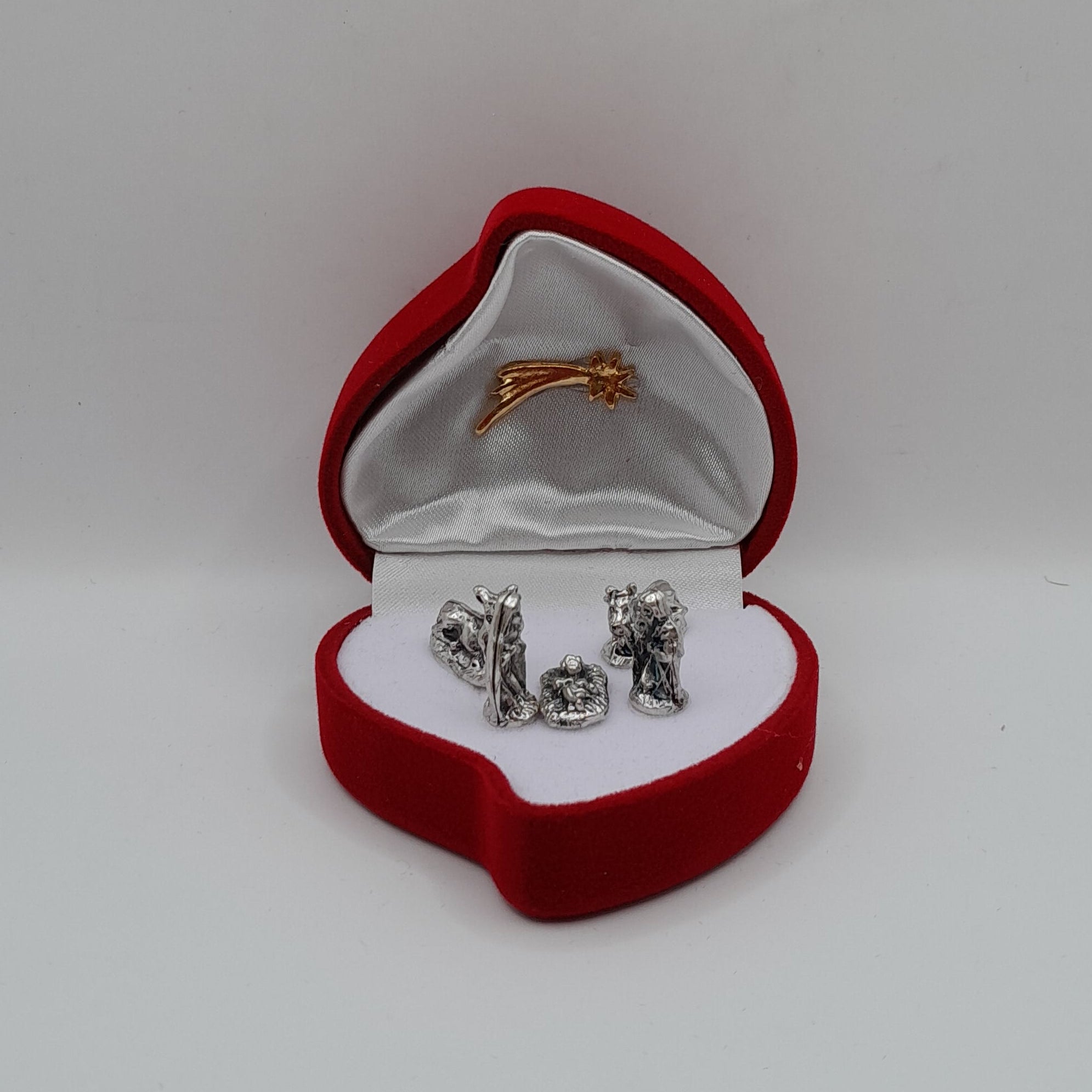 Eine kleine Krippenszene mit silberfarbenen Figuren und einem goldfarbenen Stern findet sich in dieser Schatulle.