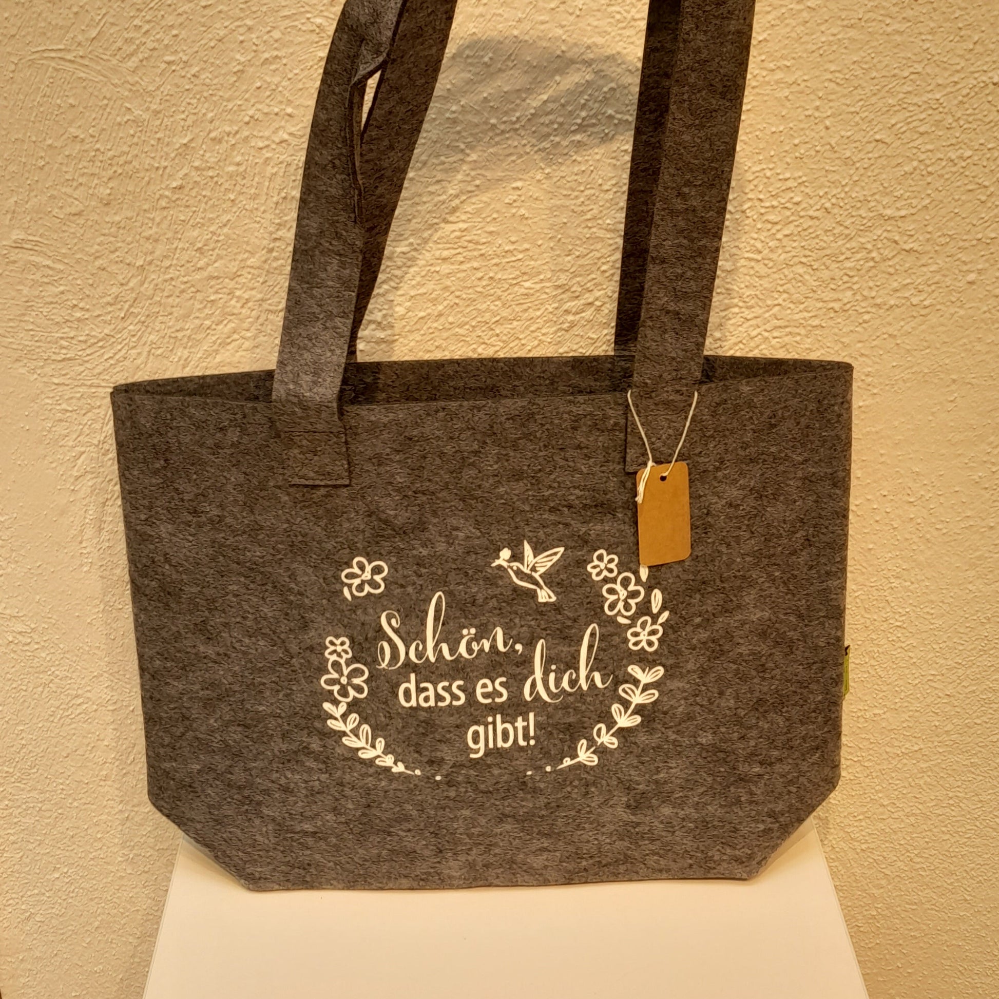 Praktische Einkaufstasche aus grauem Filz, weiß bedruckt, mit langen Henkeln