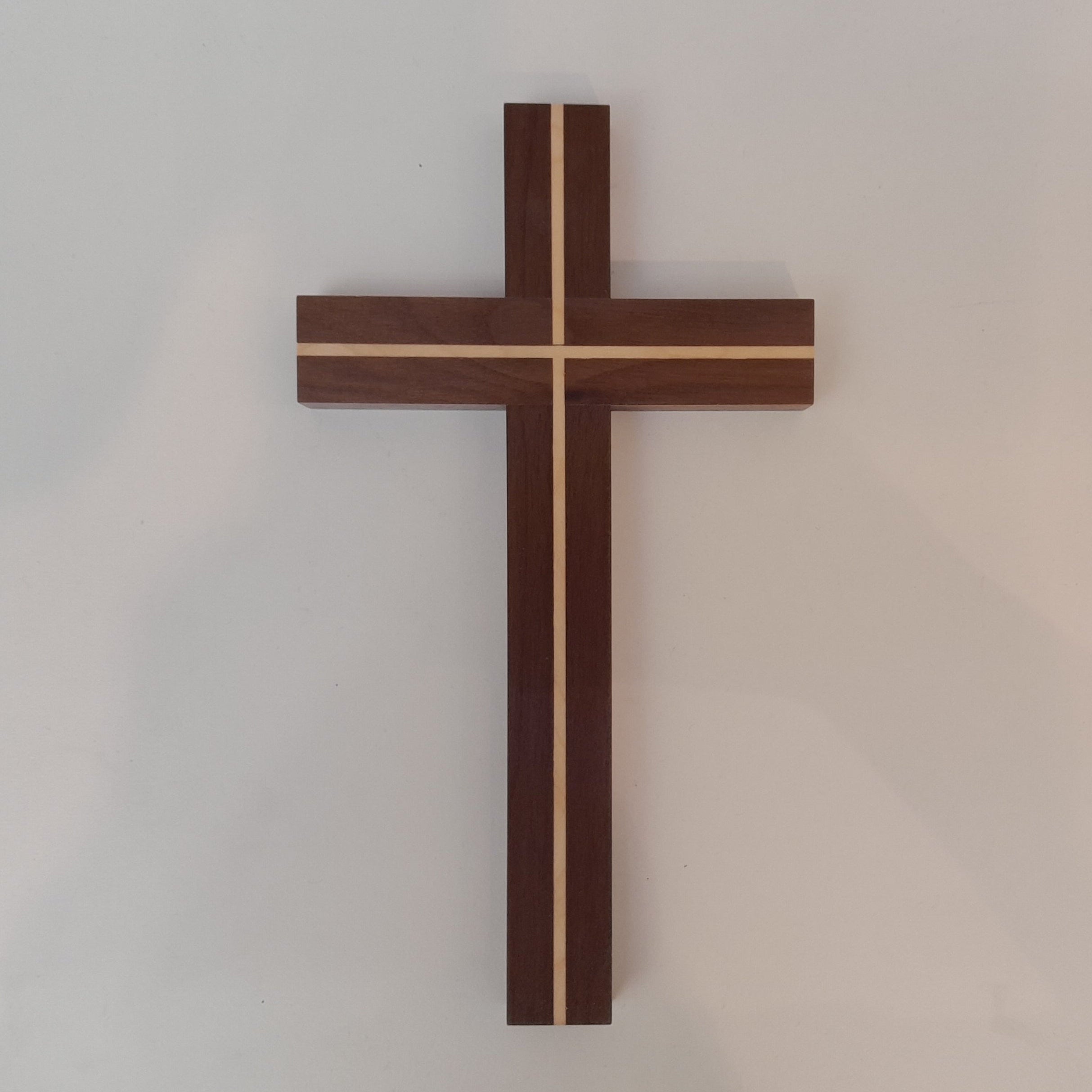 Zweifärbiges, modernes Wandkreuz aus dunklem Nussholz,