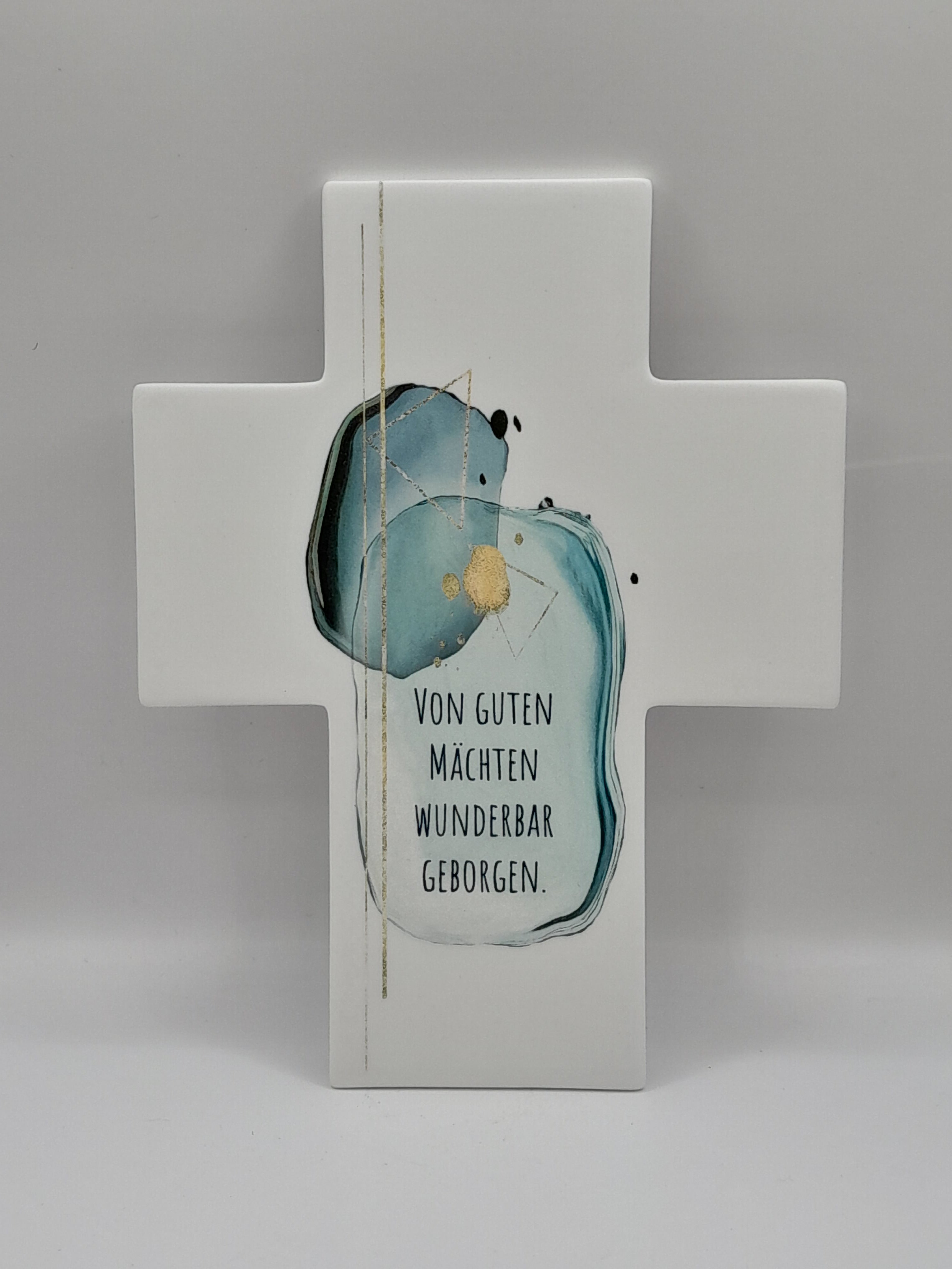 Sehr elegantes Wandkreuz aus weißem Porzellan, bedruckt mit einem Muster,