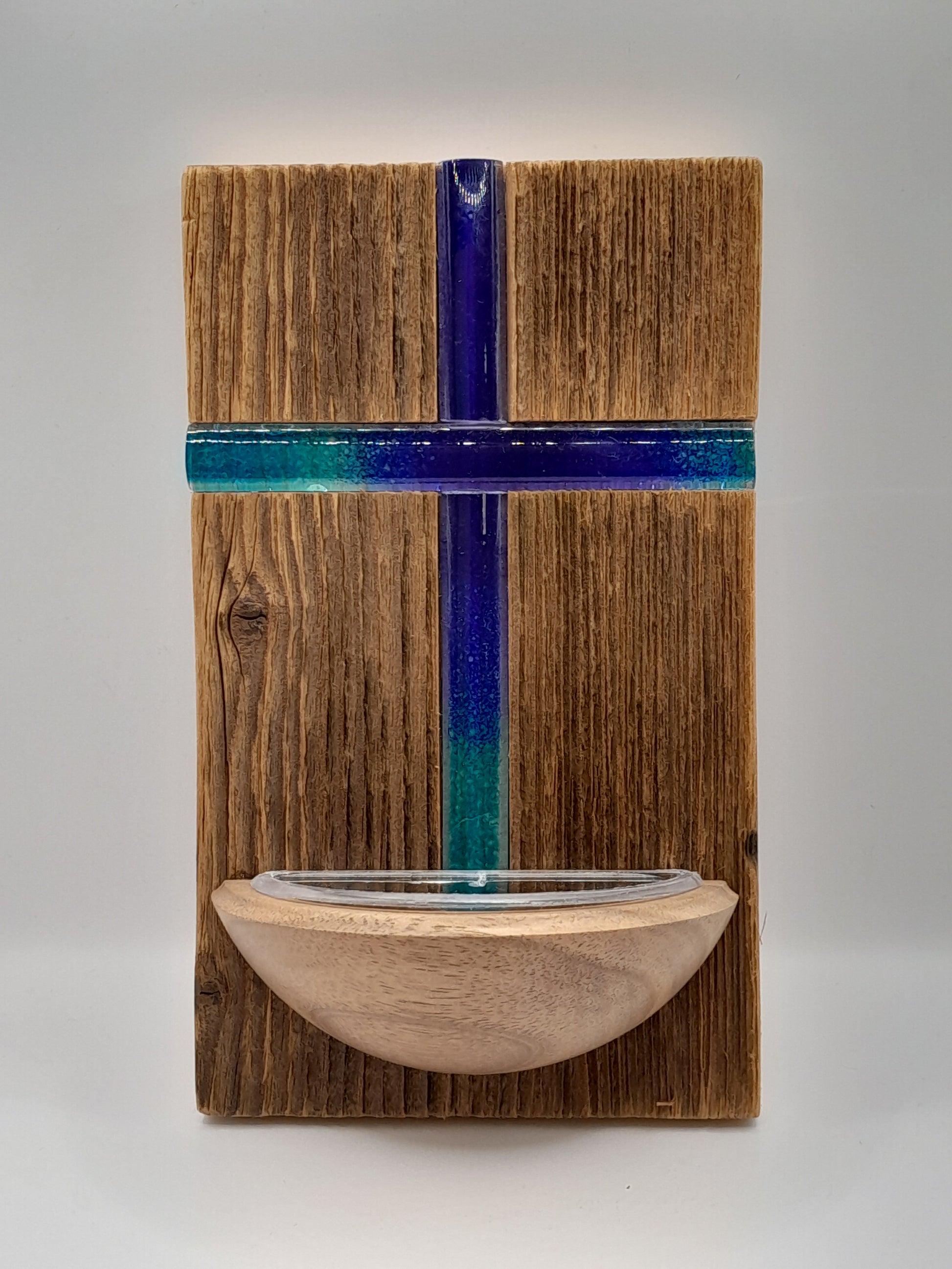 Weihwasserkessel Holz/Glas "Glaskreuz blau/grün"