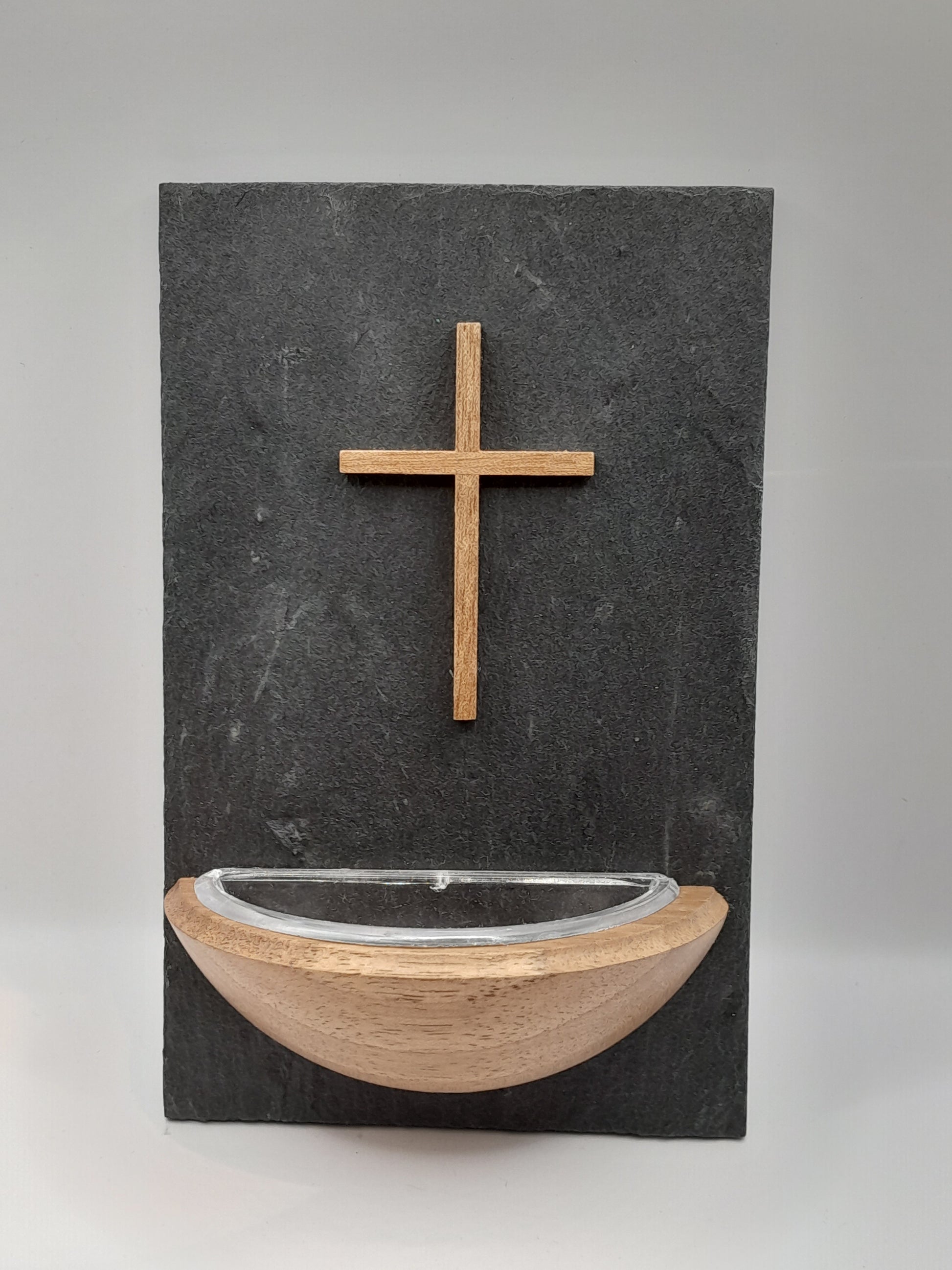 aus grauem Schiefer, mit Kreuz und Behälter aus Nussbaumholz
