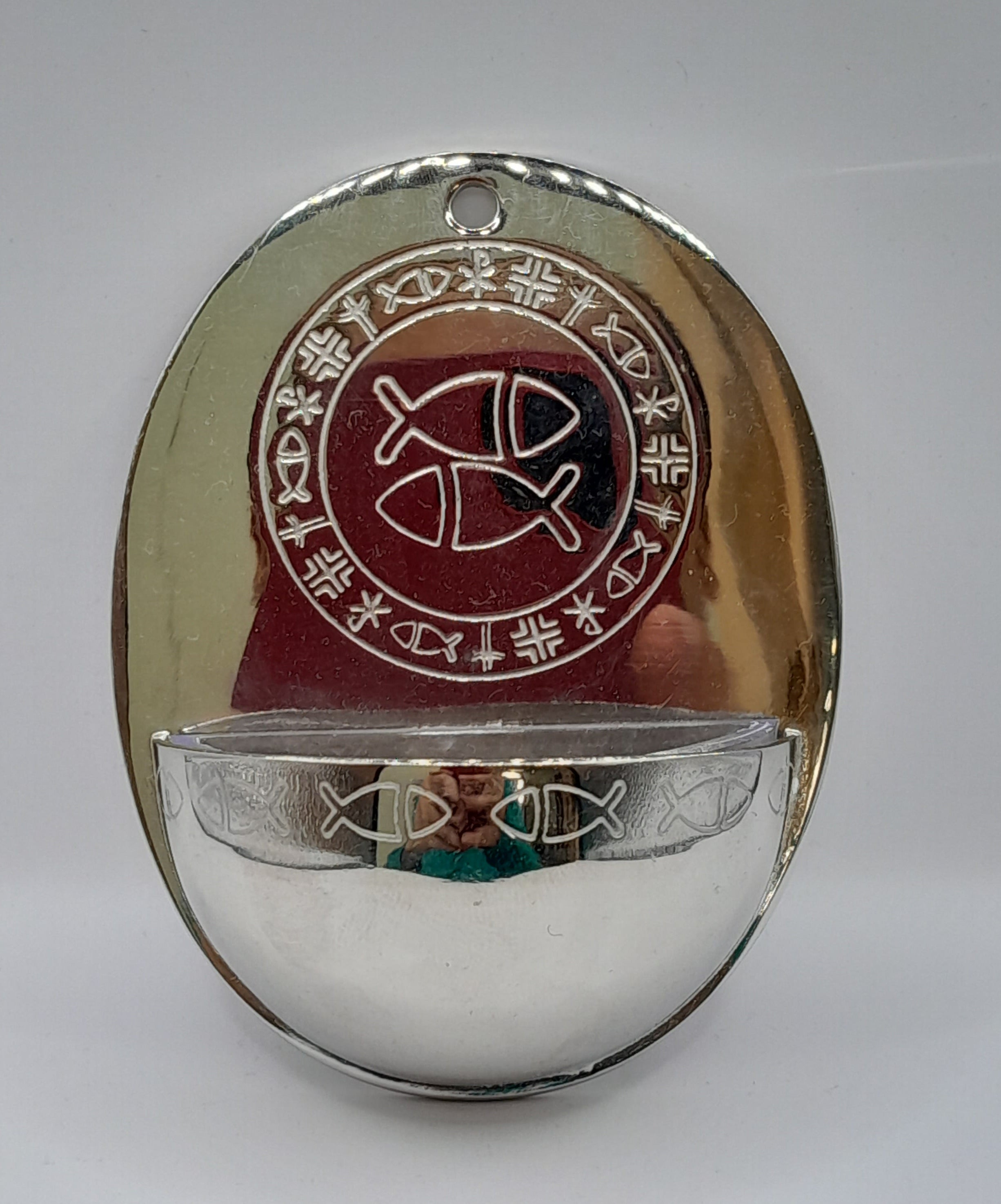 aus silbernem Metall, hochglänzend, mit Motiv aus Fischen und Kreuzen