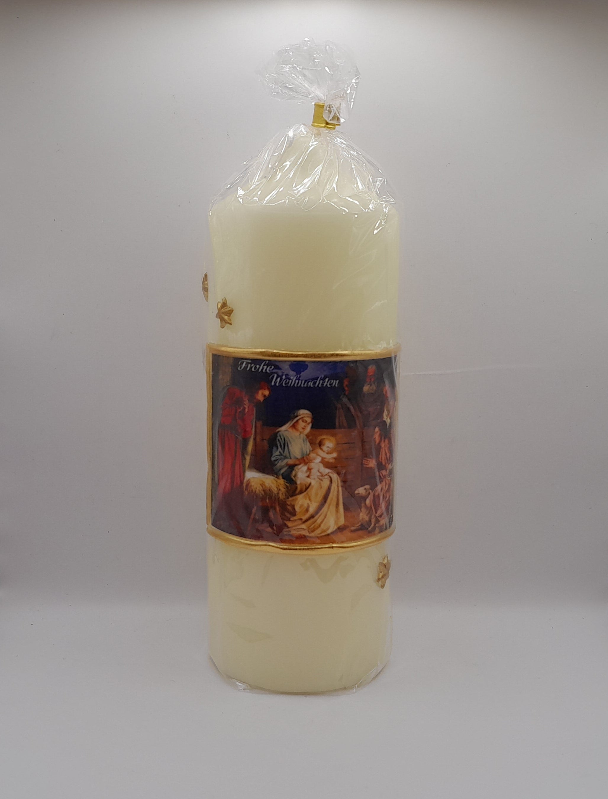 bedruckt mit Krippenmotiv und dem Text "Frohe Weihnachten", verziert mit goldfarbener Wachsauflage